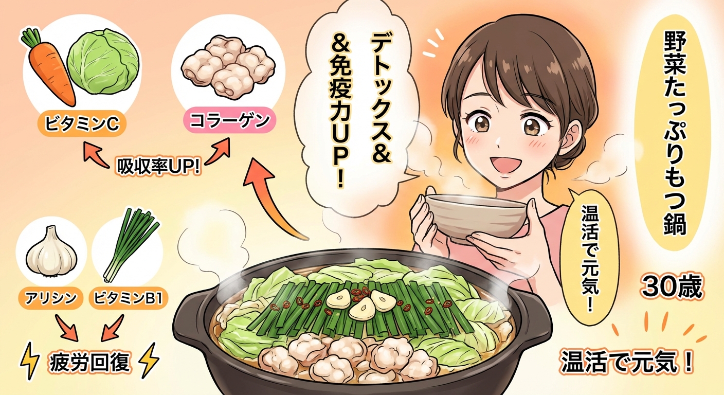また、ニラやにんにくに含まれる「アリシン」は、もつのビタミンB1の吸収を助け、疲労回復効果をさらに高めてくれます。温かいスープで体を芯から温めることで血流も良くなり、基礎代謝や免疫力の向上、老廃物のデトックス効果まで期待できる、まさに一石二鳥以上のメニューです。
