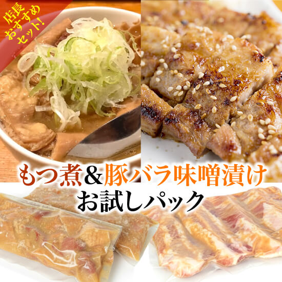 人気の「本気のもつ煮込み」2パックと、「岩中ポークバラ味噌漬け」1パックをセットにしたお試しパック。 たっぷり楽しめて税込3,300円!